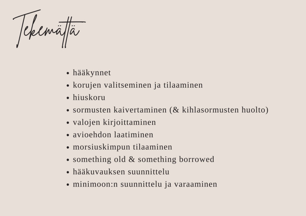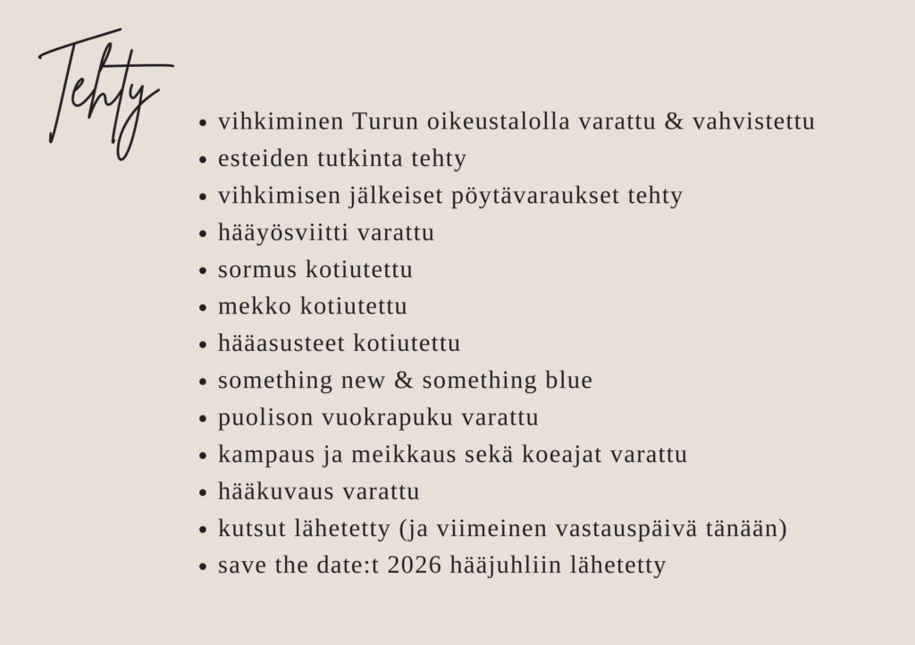 Toki vielä on joitain juttuja listalla, eli ihan vielä ei pääse huokaisemaan helpotuksesta ja kävelemään vihkitilaisuuteen paikalle. Mutta mielestäni alkaa olla aika pienestä kiinni, että nämäkin menevät maaliin asti – kun vaan hoitaa pois 🙂
